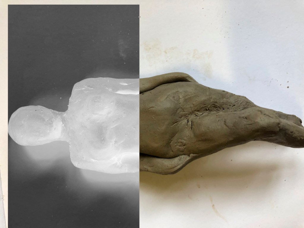 Following feedback from my tutors and peers, I realised I wanted to represent disconnect in a modern, digital future more clearly and conceptually than I had in my previous work (having used paint and physical fragmentation of the images I’d created). I was still interested in the idea of taking a complete or ‘perfect’ human form, which effectively communicates the idea of the self, and distorting it with documentation. This drew me to clay as the next medium I would explore as it is a natural, malleable material that would allow me to create a raw and natural-looking human form.