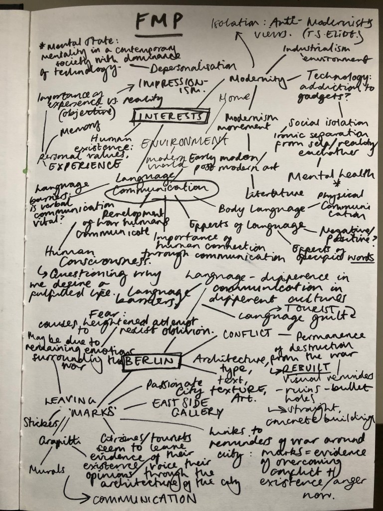 FMP Initial exploration of ideas: I used a mind-map format to collect all of my general interests, both within and outside of art, onto one page. With the Berlin trip so fresh in my mind, I was able to identify specific things about the experience that caught my attention.